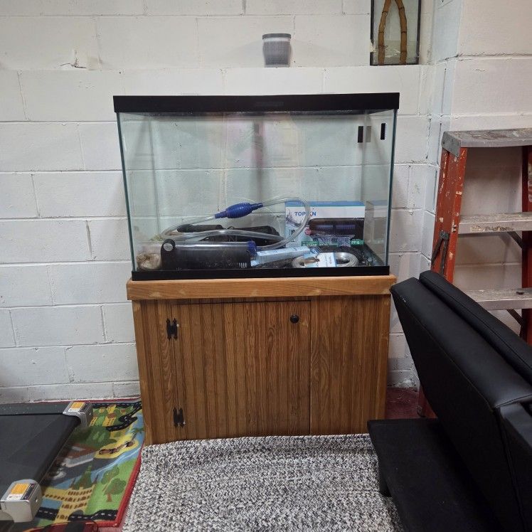 75 gallon fish tank comes with all accessories needed to start up. Includes handmade wooden stand.