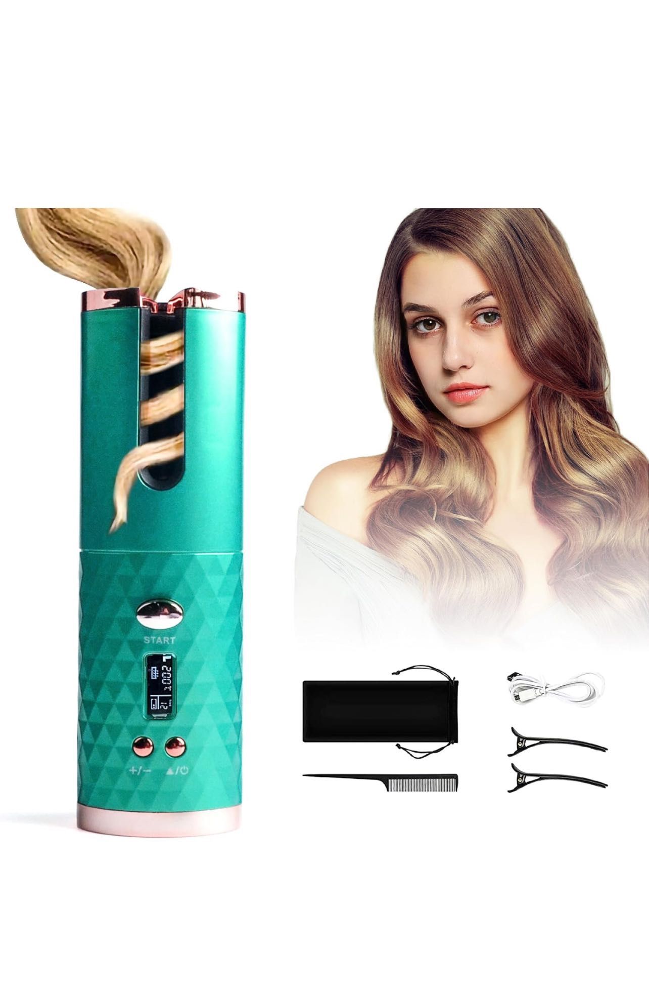 Automatic Curling Iron, Hair Curling Iron for Hair Styling, Cordless Auto Hair Curler, with 6 Temps and Timers, Auto Shut-Off, Fast Heating, Rechargeable Cordless Hair Curler 1 (Green)