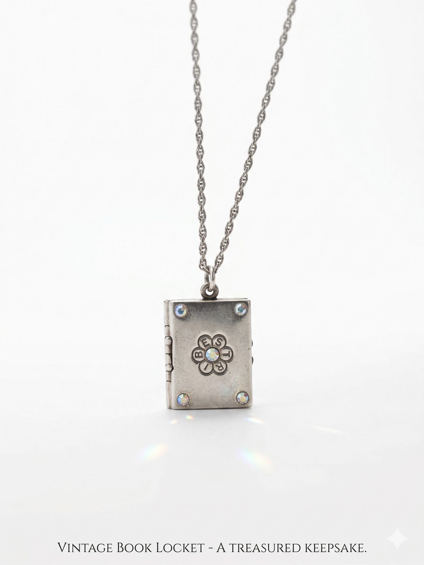 Vintage Book Locket Necklace Pendant Charming vintage-style silver-tone book locket pendant necklace with a unique hinged design that opens like a miniature book. Inside, it is engraved with the sweet phrase “Through Thick and Thin” with two small heart details, making it a meaningful keepsake or gift for a close friend, sister, or loved one. The front cover features a floral motif accented with rhinestone-like details for added sparkle. Suspended from a matching chain, this piece has a whimsical, sentimental look that is perfect for everyday wear or layering. Features: Book locket and chain are made of genuine 925 Sterling Silver vintage book locket pendant Opens on a hinge like a mini book Interior engraved: “Through Thick and Thin” Decorative floral cover with sparkling accents Includes matching chain Meaningful friendship or sentimental gift piece Great for: friendship gifts, sister gifts, keepsakes, vintage jewelry lovers, or anyone who loves unique lockets.