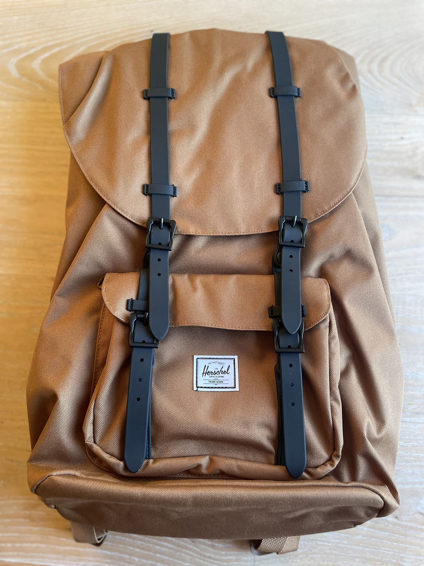 Little America brown backpack with pinstripes lining and a laptop pouch. Brand new!