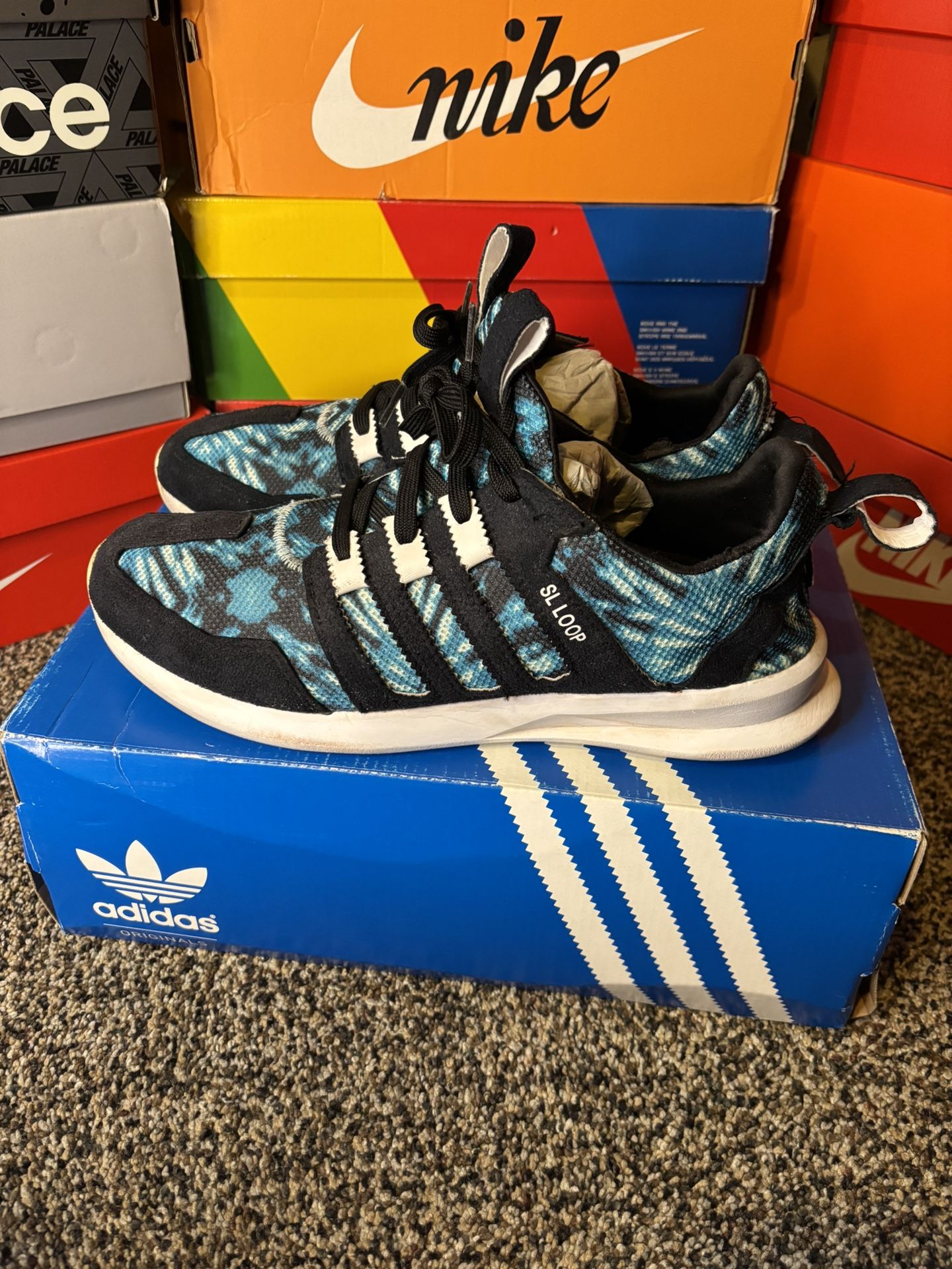 Size 11 *sneakers are very worn* insoles have been worn down, the back pull tabs sewing is also coming apart. A couple scuffs and a bit of yellowing on the front toe pad. Also some fading on the front logo. But still a pretty neat shoe i think it could still have some life left and not sure how rare it is. Definitely in need of a little repair though. Message me for any questions! ** i tried my best to picture imperfections please view all pictures carefully before purchasing ** Check out my other listings!! Adidas originals, blue tie dye, running shoe