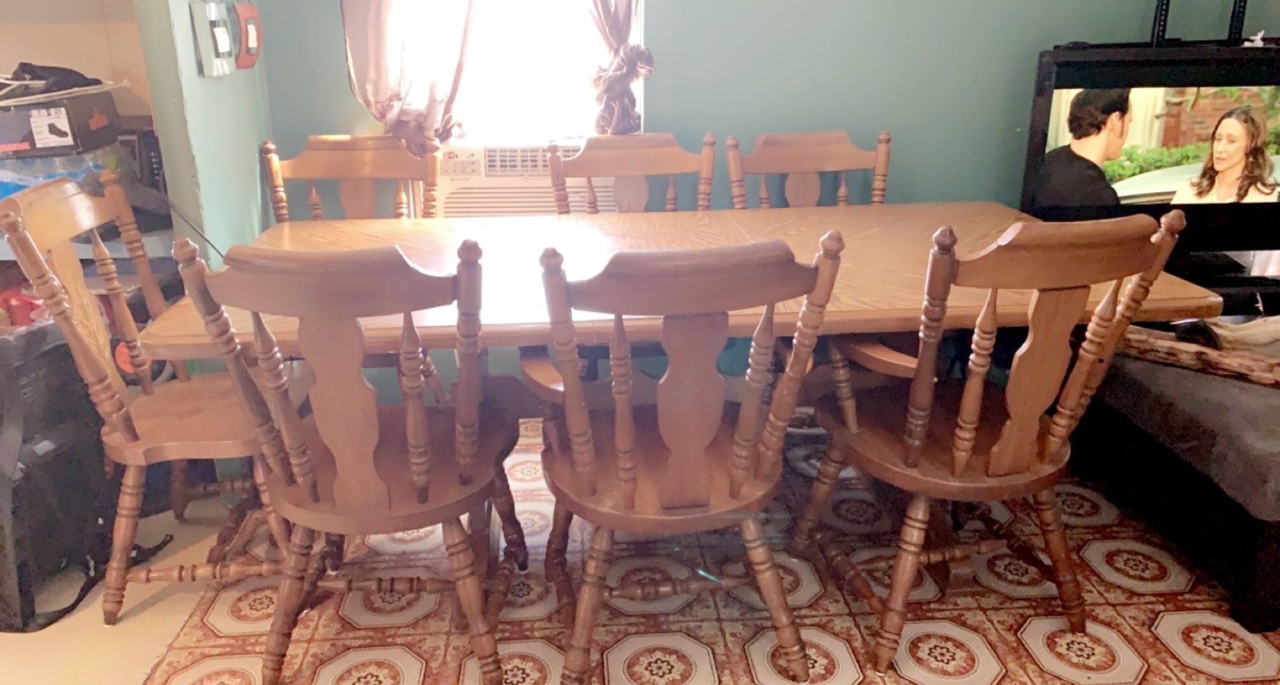 Selling dining table with 8chairs it’s heavy so have to bring someone to help you carry out selling it because it’s to big for my dining room