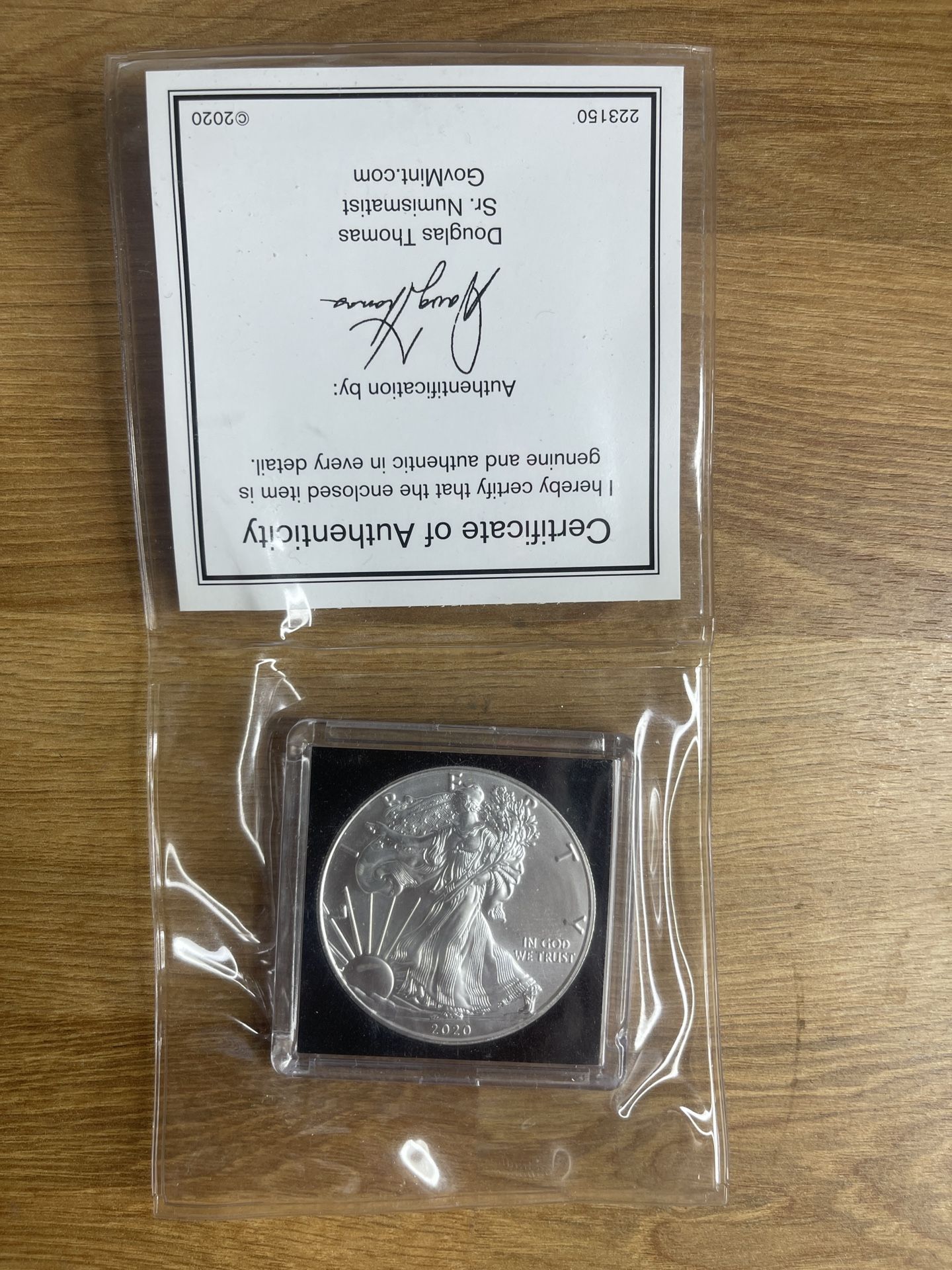 2020 American Silver Eagle bullion coin, 1 troy ounce of .999 fine silver. Comes in protective capsule with original GovMint certificate of authenticity. Standard bullion issue, not graded and not a proof. Coin is clean and well kept. You will receive exactly what is shown in the photos.