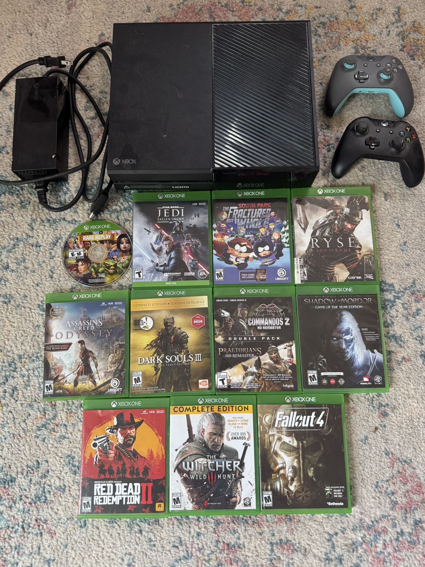 Fully working Xbox One 2 Controllers (one pro) Power cord 12 games - Red Dead Redemption II - The Witcher IlI Wild Hunt (with DLCs) - Fallout 4 - Assassin’s Creed Odyssey - Dark Souls III (Fires Fades Edition) - Shadow of Mordor (Game of the Year Edition) - Star Wars Jedi Fallen Order - South Park: The Fractured But Whole - Ryse: Son of Rome - Commandoes 2 (HD Remaster) - Praetorians (HD Remaster) - Rare Replay