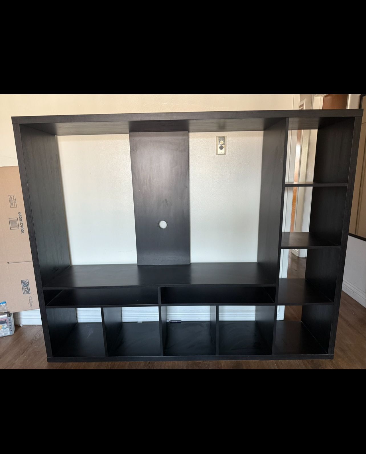 Black, wooden, very sturdy, and includes organizer shelfs built in.