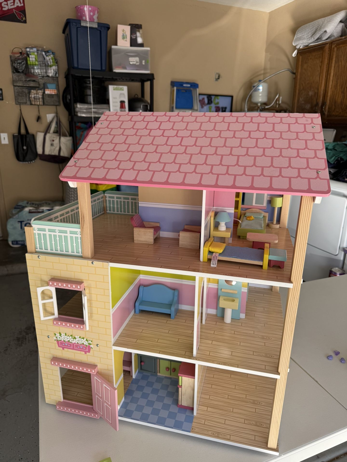 Hearthsong wooden dollhouse 24.75”L x18”wx29.5”h large enough for several kids to play at once. Rests on a wooden turntable that rotates 360 degrees. Very sturdy and looks brand new. Furniture set included. Windows and doors open and close. Bought it last year for our daughter and it sat on her shelf. She played with it maybe twice.