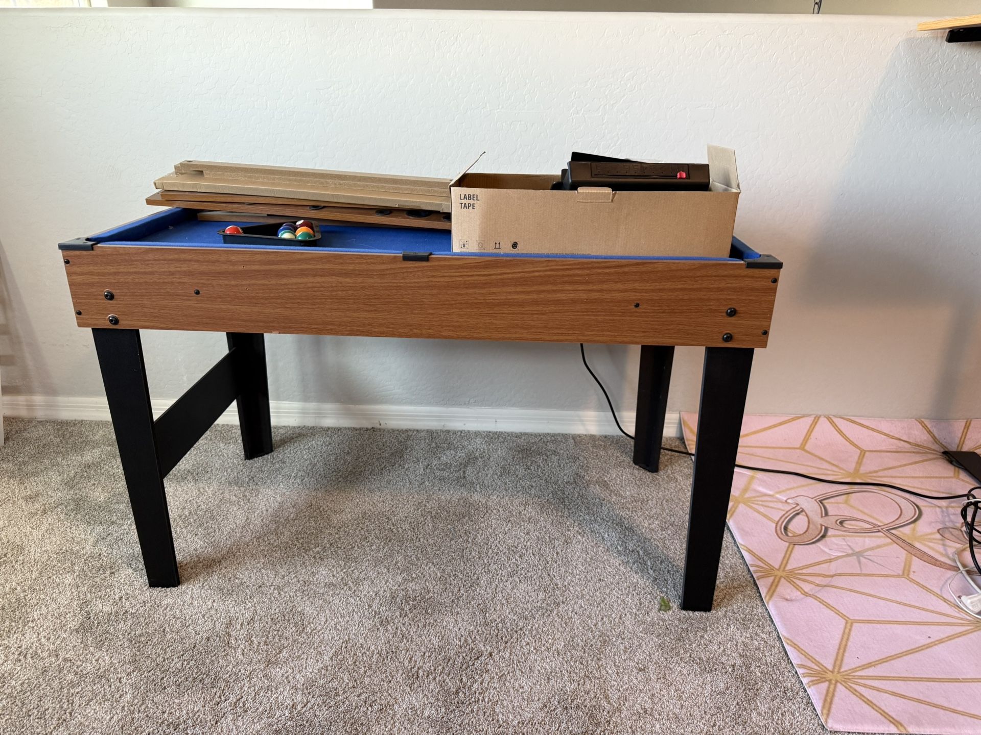 This is newly opened. It has only been set up for pool, but has all other pieces to make it a foosball table as well as other games. Asking $90