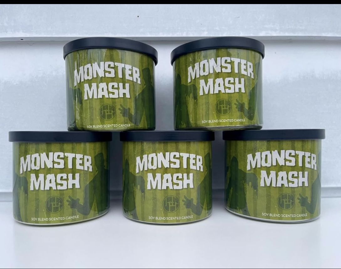 SELLING 4 For $20 ✨ BRAND NEW - NEVER USED ✨ 4“ Diameter x 3.5“ High / Tall Monster Mash Halloween Themed Candle Great Noticeable Scent Bakery, Sage, Floral 3 Wick Green Candle Wax Green Color Jar Includes Removeable Sealed Lid 14 oz. ounces Made is USA Seasonal Holiday Gift
