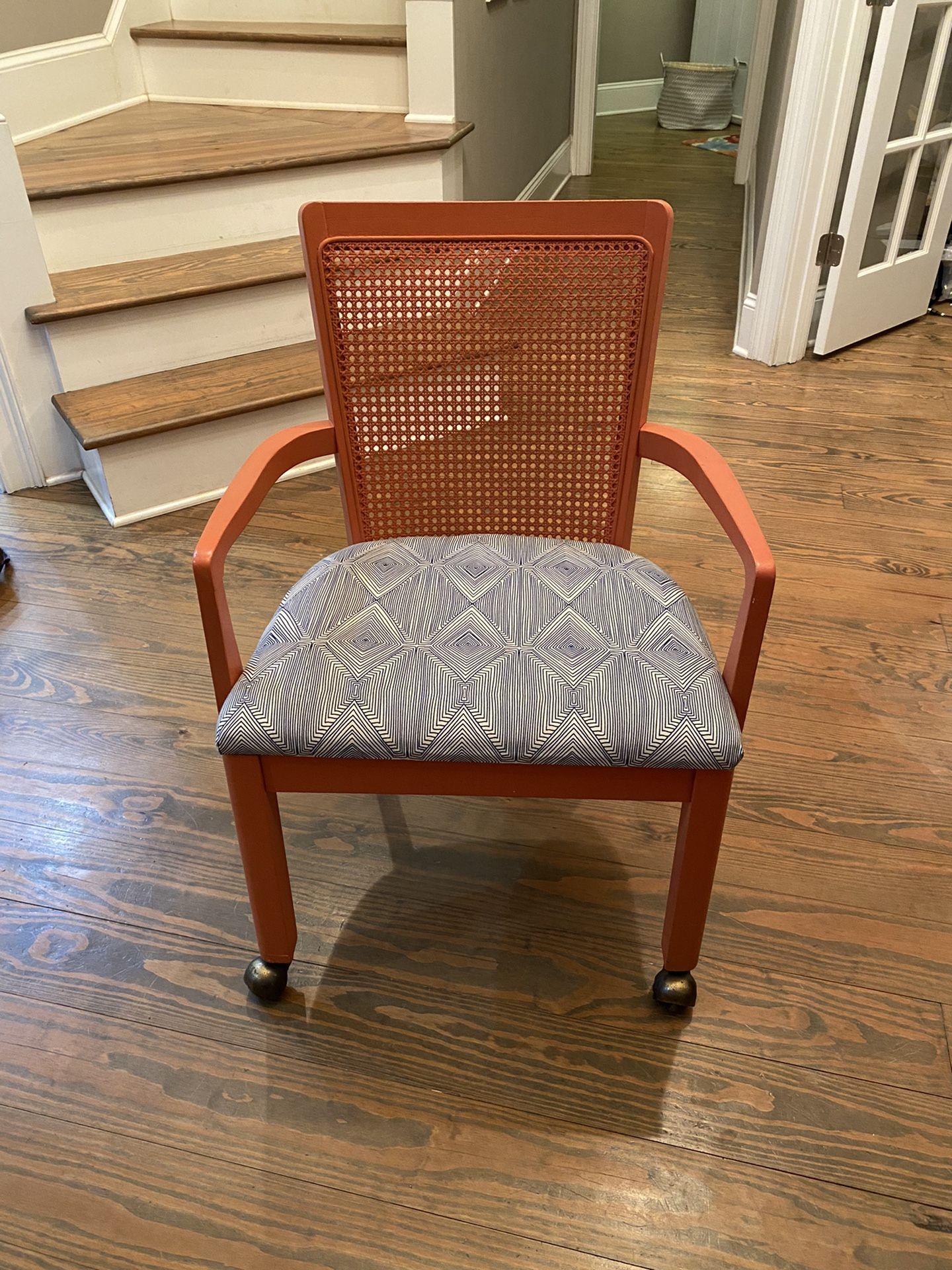 Orange chair with custom blue and white upholstery on brass casters. Chair is in excellent condition. Smoke free home.