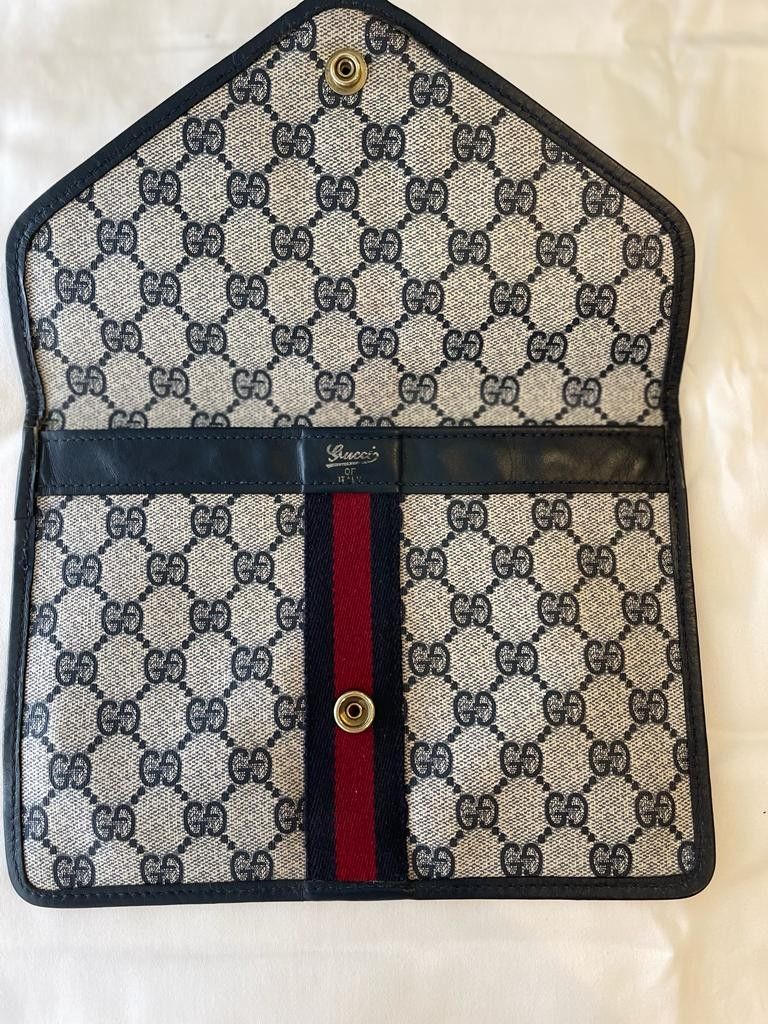 Does Show minimal wear. Small spot has peeled at the top of the leather part on flap where you push down to close. Hardware is in excellent condition. Bag exterior is in excellent condition Bag interior is in like new condition. Refer to photos for more detail. I can provide extra pictures. This gorgeous clutch is such a statement piece and adds that extra touch to any outfit you https://offerup.com/redirect/?o=d2Vhci5JdA== features Navy GG printed canvas leather trimming and the signature gucci red and blue web stripe down the middle and back.The condition of this clutch is great despite it being a vintage piece shows minimal wear. The Gucci stamp inside faded a bit overtime.