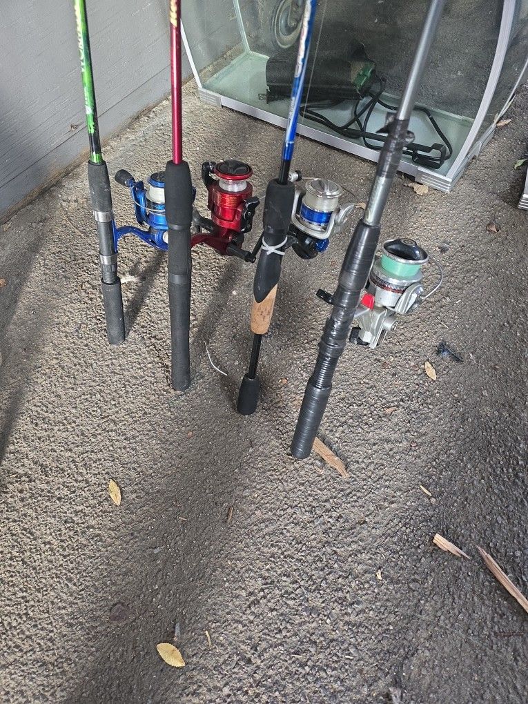 4 FISHING COMBO SETS (RODS WITH REELS) GREAT CONDITION LIKE NEW 6 FT LONG LINE WIGHT 4-10LB. GOOD FOR LAKES AND RIVER (FRESHWATER) FOR ADULTS GOOD FOR RIGHT AND LEFT HANDED ✋️ ASKING PRICE FOR EACH COMBO-$30 OR FOR ALL 4 COMBO -$99 LOCATED IN NORTH HOLLYWOOD CA