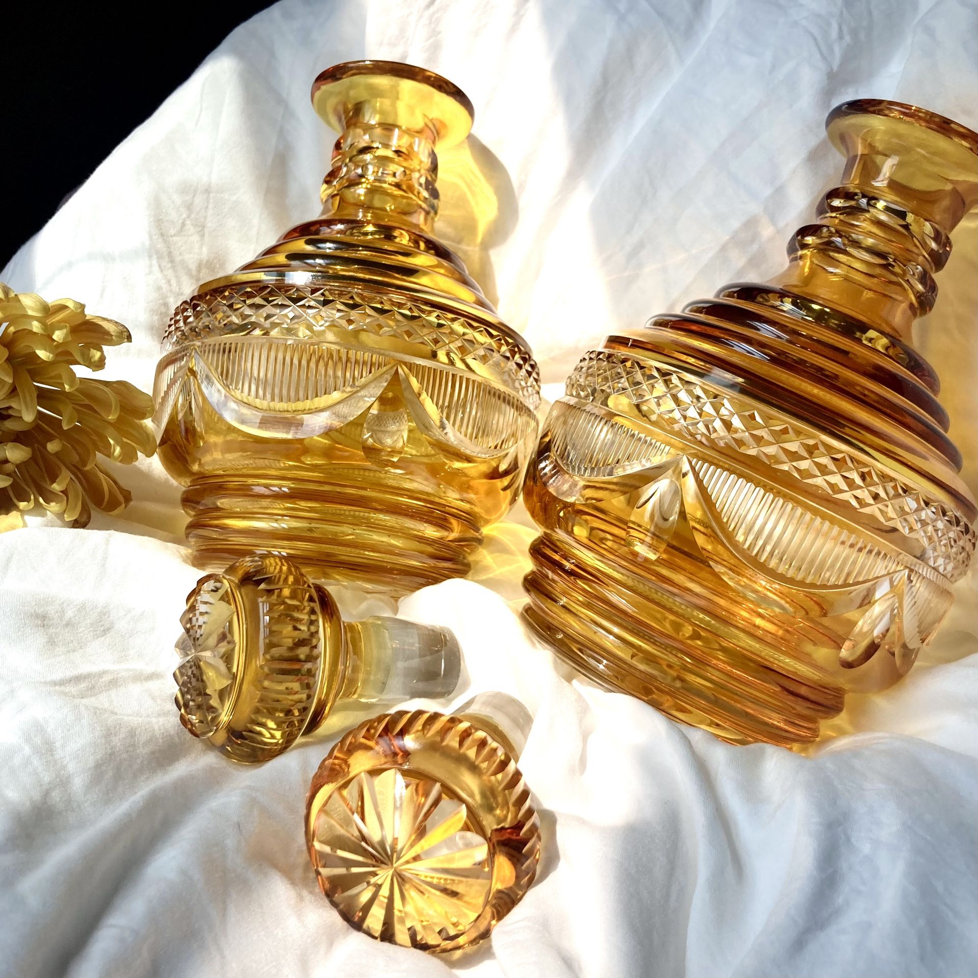 β¨ππ―πβ¨ BEAUTIFUL pair of royal draped Bohemian honeycombs, perfect for serving your favorite libations π·ππ· Warm, diamond & drape patterned cut to clear Amber glass. Star cut stopper and base. Numbered corresponding stopper/decanter (42 & 47). Specific measurements listed below. π» Please do not hesitate to message me for additional info/photos/measurementsβΌοΈ *** Please see only signs of wear ~ Few nicks to bottom of # 47 stopper (pic #7) ~ Nick to honeycomb (pic #9) *** Blue arrows illustrating BOTTOM of decanter show natural glass qualities & are not flaws (pic #11) π *Weight ~ approx 2.5 & 3 lbs *Height ~ approx 9β & 9.25β *Circumference ~ approx 15.5β & 16β *Base diameter ~ 2.25β