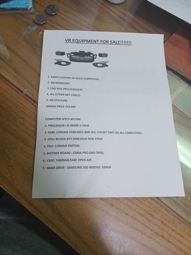 Hello everyone we closed our virtual reality Gaming center in Wheaton IL we would like to sell the following Gaming Computer consist of 8 computers ,,Six computer Monitors, Total of Five Working Vive Pro Head-Sets Eithernet Cables,SIX Stations And All Thermo Proven Curtains, ,, price is $17,000 Items for Sale consist of : 8 built computers: Computer list is below: Processor I5-9600K 3.7GHZ RAM :CORSAIR VENEANCE 8GB LED COUNT TWO ON ALL COMPUTERS. GPU: NVIDIA RTX 2080 ASUS ROG STRIX PSU:CORSAIR RM750X POWER SUPPLY MOTHER-BOARD: Z390A PRO (MS-7B98) CASE:OPEN AIR THERMALTAKE HARD-DRIVE:SAMSUNG SSD 860EVO