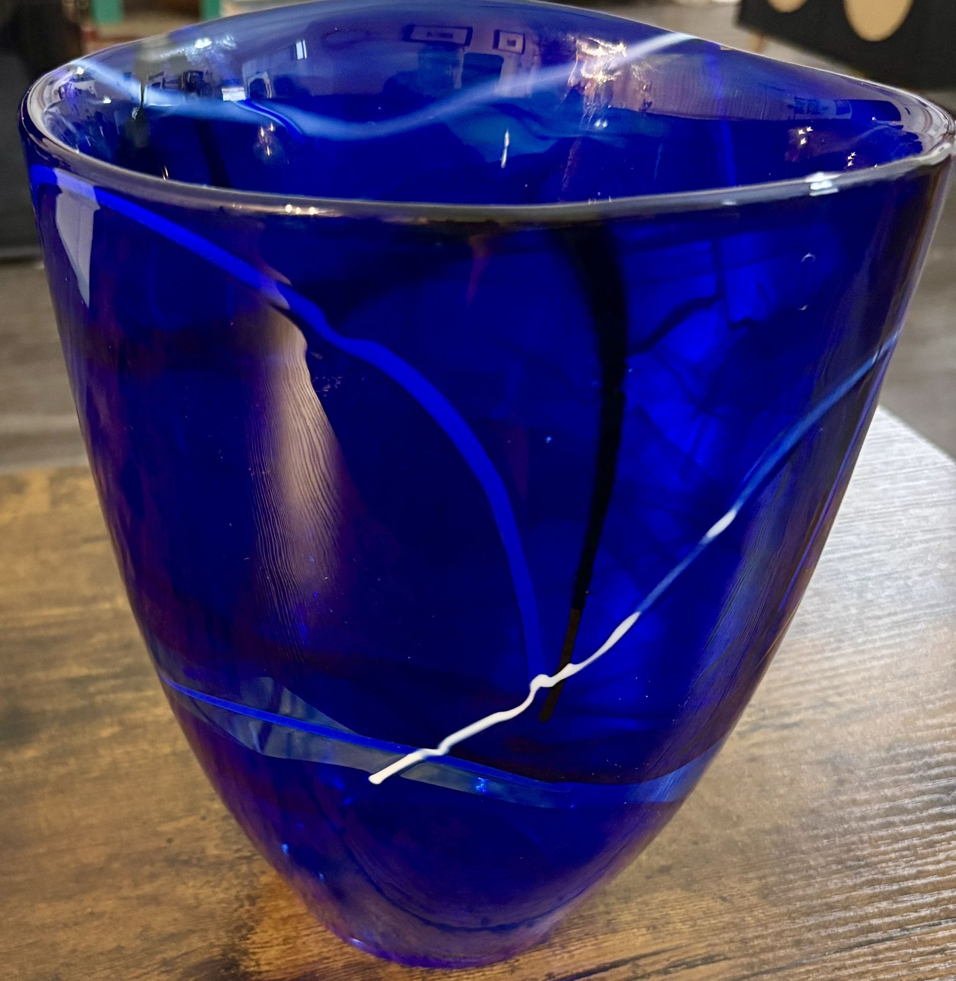 For sale is a beautiful heavy art glass vase from Kosta Boda, designed by Anna Ehrner as part of the "Contrast" series. It features a deep cobalt blue color with free-flowing white swirls inside the glass. • Designer: Anna Ehrner (Sweden) • Markings: Marked "Kosta Boda" on the base. • Dimensions: Approx. 8" tall x 8" wide at the rim. • Condition: Excellent vintage condition with no chips or cracks. There is some normal shelf wear/scuffing on the bottom surface consistent with age. • Weight: Heavy, substantial piece (approx. 7 lbs). Great center piece or addition to a Scandinavian art glass collection.
