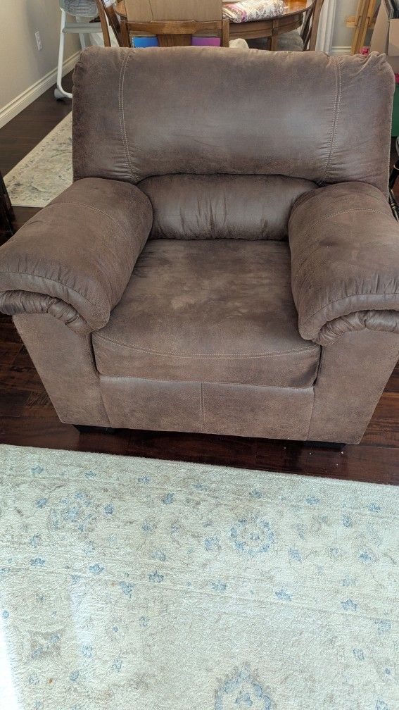 Bladen by Ashley Furniture arm chair in coffee color. Barely used, very comfortable. We have two of these and since adding the Bladen couch to our living room, we do not have space for both arm chairs. Pet friendly home so there are some light scratches on the front legs but they are difficult to see. But chair is clean and barely used. Dimensions included in photos.