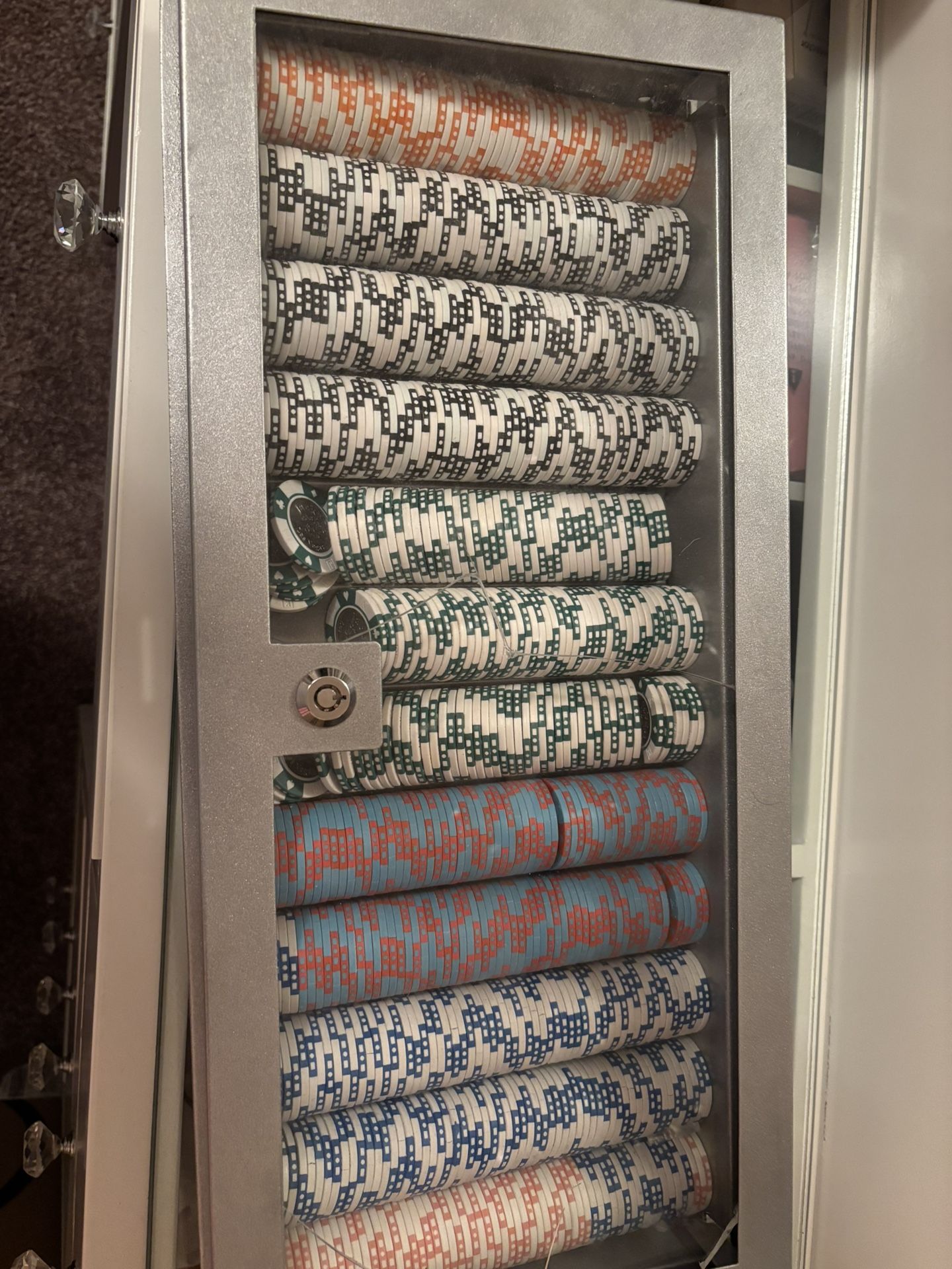 Asking $300 a set or better offer. Brand new. I have regular poker chips & naughty (naked ladies) on poker chips. Cases in pictures included. Larger glass case is cracked but still works. Each case has keys to them also.
