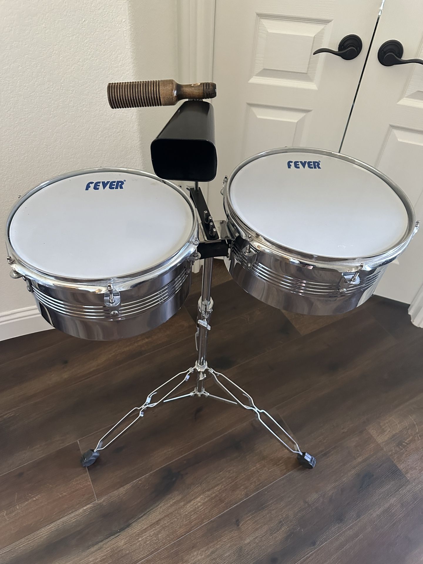 Fever Timbales Set 13 & 14 Inch With Silver Stand Used in great condition, with cow bell included