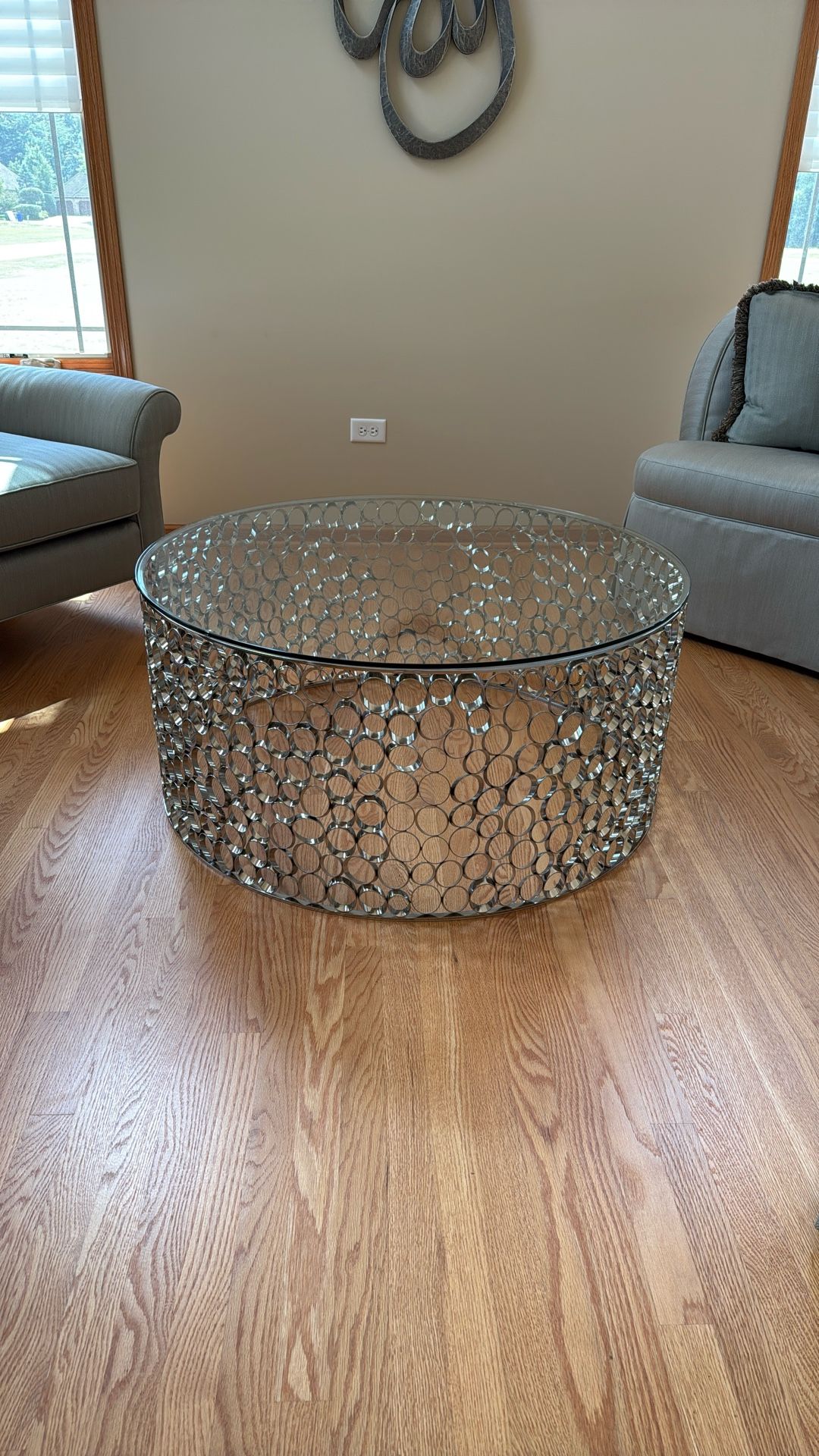 Brand new never used. This coffee table has a sturdy glass tap, and metal base.