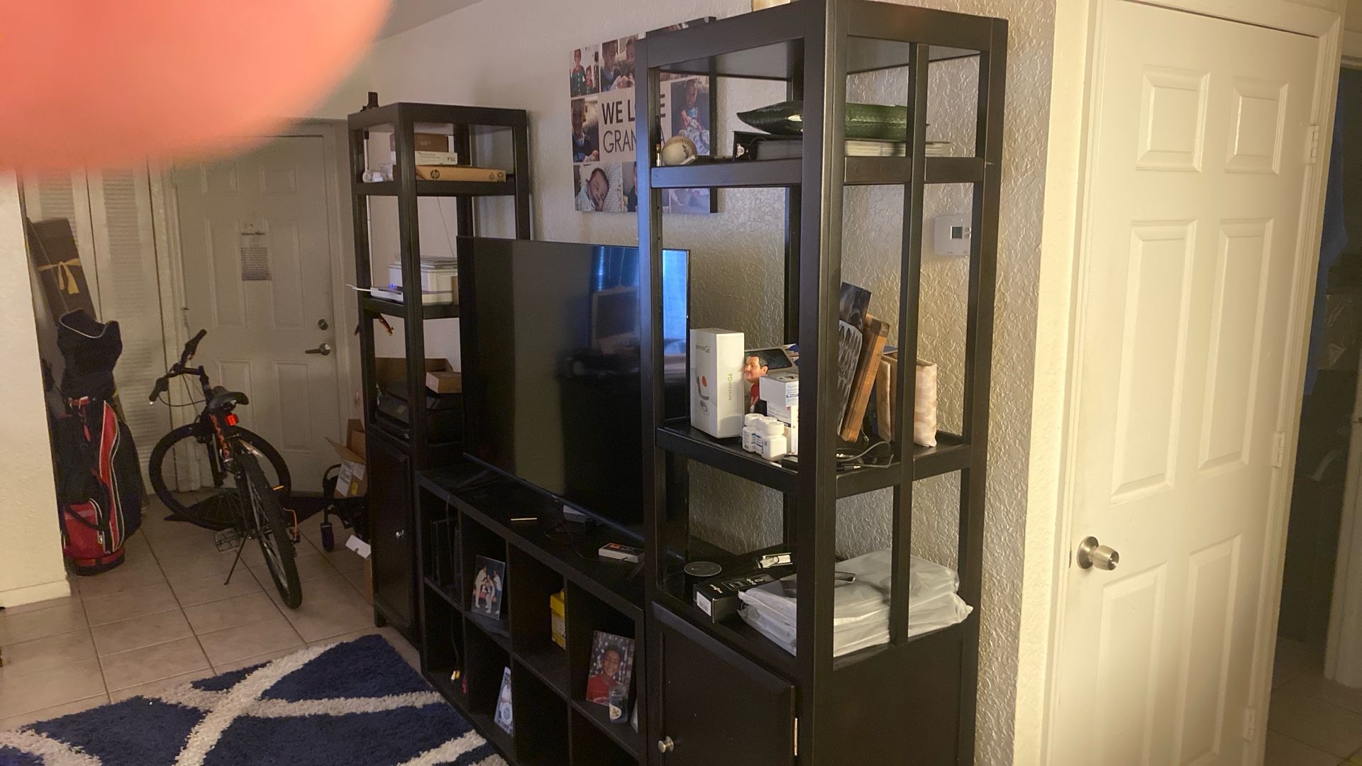 Entertainment center for your TV with two side pieces that are shelves and one recliner rocker