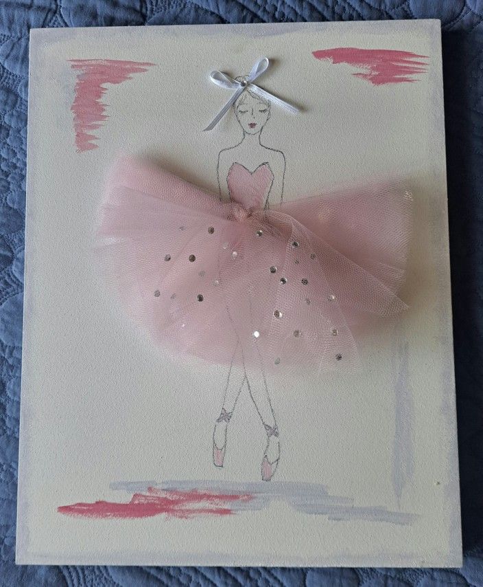 3D ballerina wall art piece, delicate sketch of a ballerina with a physical pink tulle tutu and a small white ribbon bow in her hair Cash only Contactless porch pickup in Green Brook Township