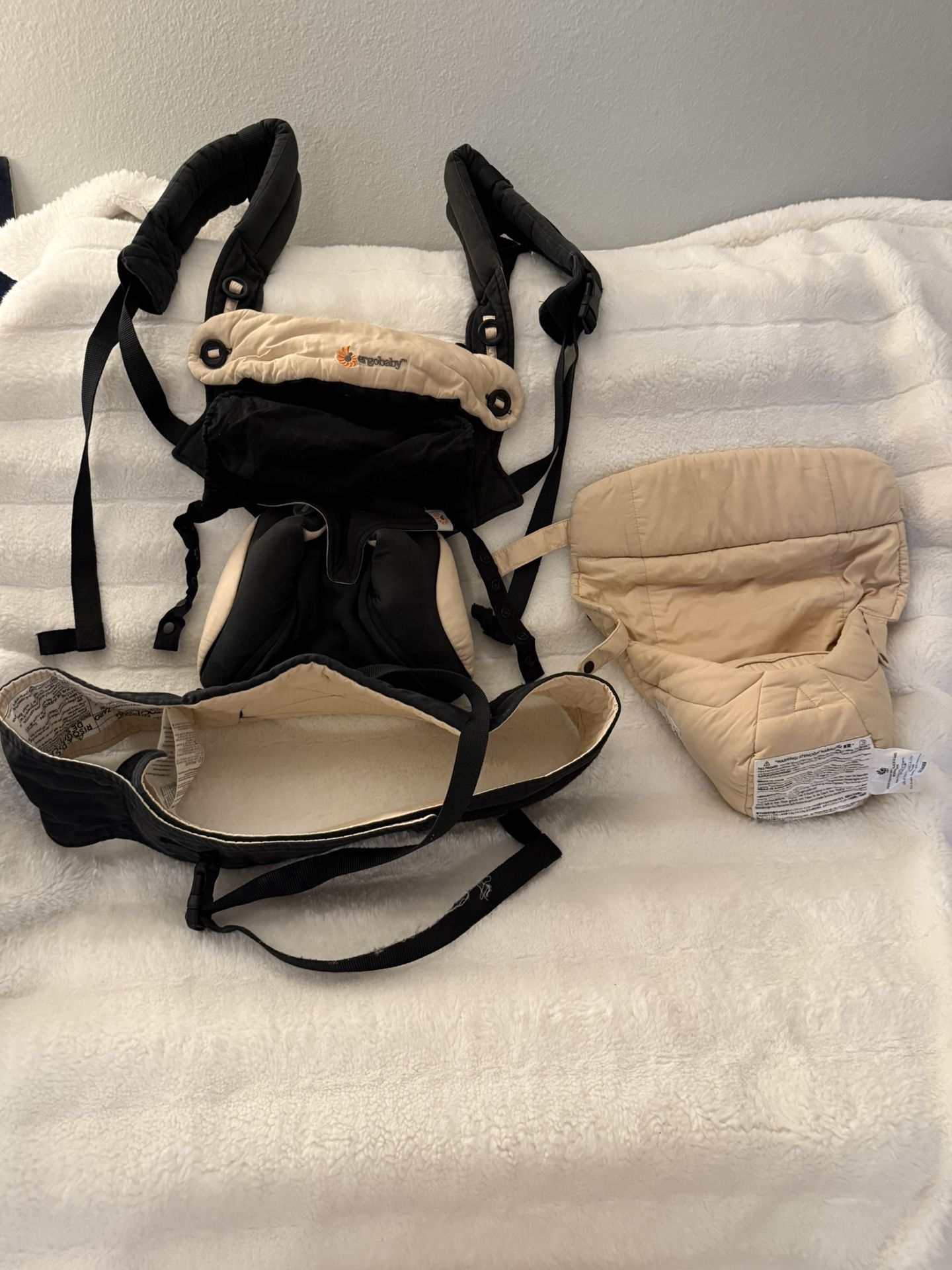 Black and camel Ergobaby baby carrier with infant insert. Clean, in very good condition. Nonsmoking home but we do have dogs.
