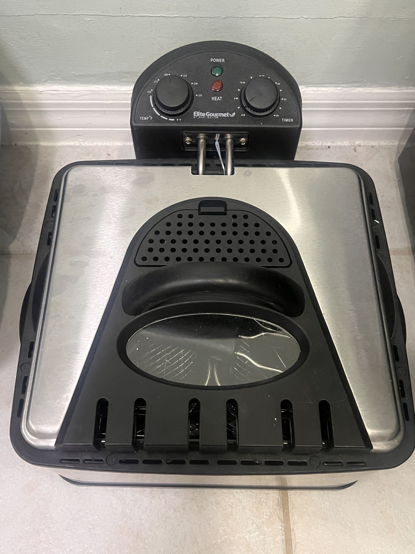 Like new! This is a Chefman (or Elite Gourmet, as indicated by the logo) 4.5-liter deep fryer. XL 4.5-quart/liter capacity Adjustable temperature control, heating up to \(375^{\circ }\mathrm{F}\) Integrated timer function Stainless steel exterior design Features a viewing window on the lid for monitoring food