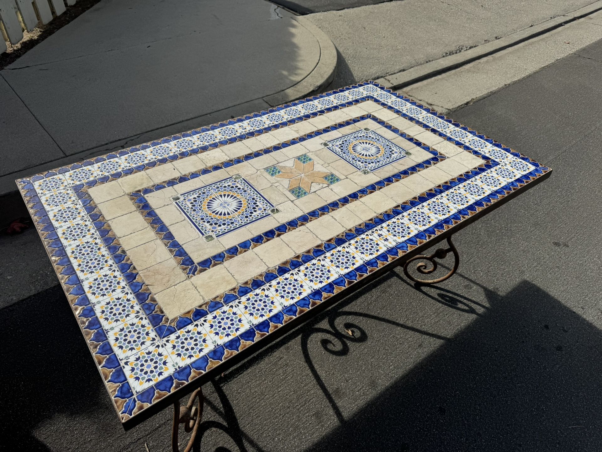 Handcrafted Mediterranean Mosaic Tile Table – Solid Iron Base Stunning one-of-a-kind mosaic tile table featuring intricate Mediterranean / Moroccan-inspired patterns in rich blues, ivory, and warm stone tones. Set on a heavy wrought iron base with elegant scrollwork, this piece is both functional and artistic. Perfect for: • Outdoor patio or garden • Indoor coffee table or entry statement • Covered terrace or sunroom Details: Hand-laid ceramic mosaic tile top Solid, heavy wrought iron base Excellent structural condition Durable and stable – built to last Unique artisan design (not mass-produced) This table instantly elevates any space and draws attention with its craftsmanship and character. FREE DELIVERY