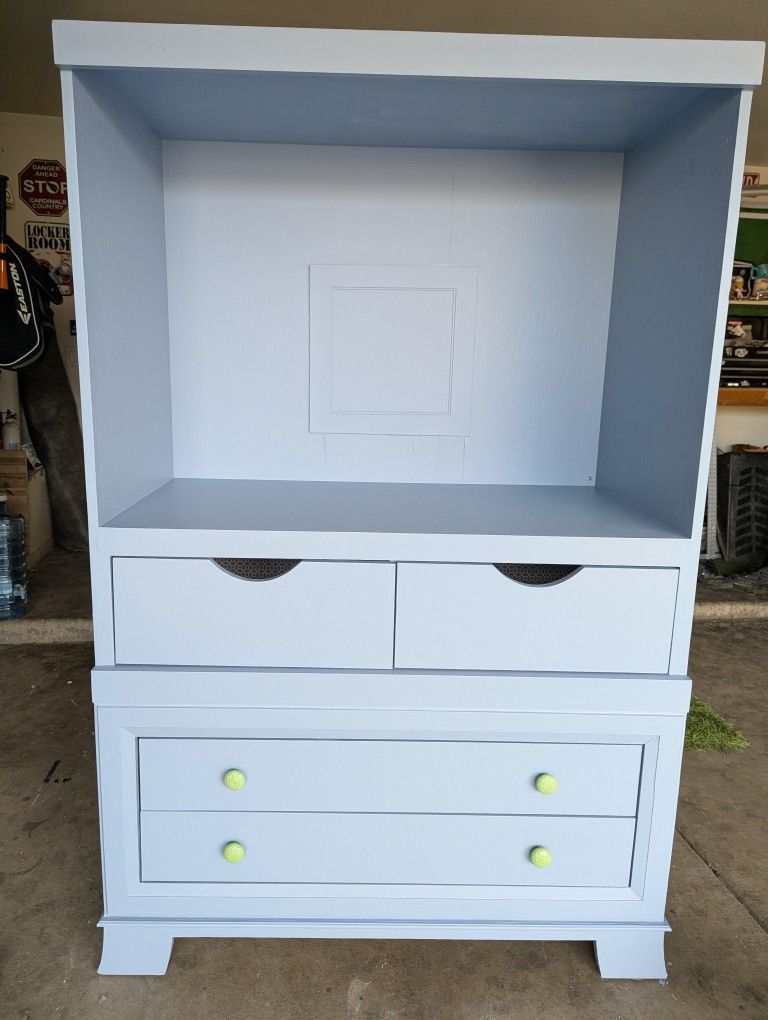 We use this as a changing table for our son. It worked out great for that as well. It's got a fresh coat of paint on it.