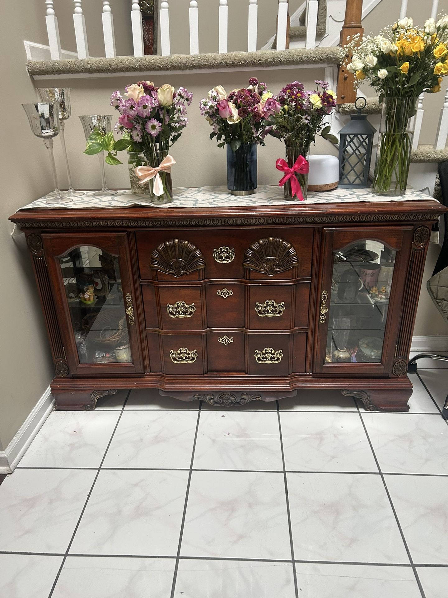 Enhance your entryway with this stylish wooden entrance table, designed to complement the dining table, chairs, and glass cabinet (also available). Entrance Table: Sturdy and stylish, priced at $200 Features: - Elegant Design: Sleek wooden frame with a timeless look, perfect for welcoming guests. - Versatile Functionality: Ideal for holding keys, décor, or other essentials in your entryway or hallway. - Condition: Great shape with a few minor scratches that add character to the piece. Pair it with the matching furniture set for a cohesive home style, or use it as a standalone centerpiece in any room. There is a dining room set, glass cabinet, and living room table that is a part of this set. Message me for more details and if you want to create a bundle with any other items on my page. 😊