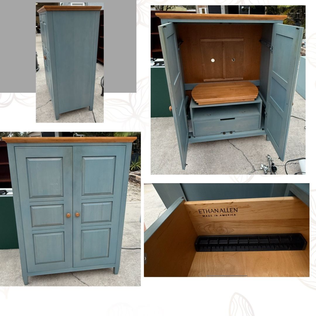 Warehouse Storage Sale (Habla Espanyol) ~ Ethan Allen ~ Country Colors ~ Denim Blue ~ Dimensions: Width 4.25 Length 22 1/8 Height 53.25 ~ Media Armoire / Office Desk ~ Smoke Free Home ~ Delivery options are available ~ Items are New & Used check description ~ Cash & Carry transaction preferred ~ No holds ~ We require appointments for pickups/ deliveries ~ DON’T FORGET TO FOLLOW US ONLINE TO GET OUR DAILY LISTINGS OR CALL IF YOU NEED HELP SELLING YOUR ITEMS