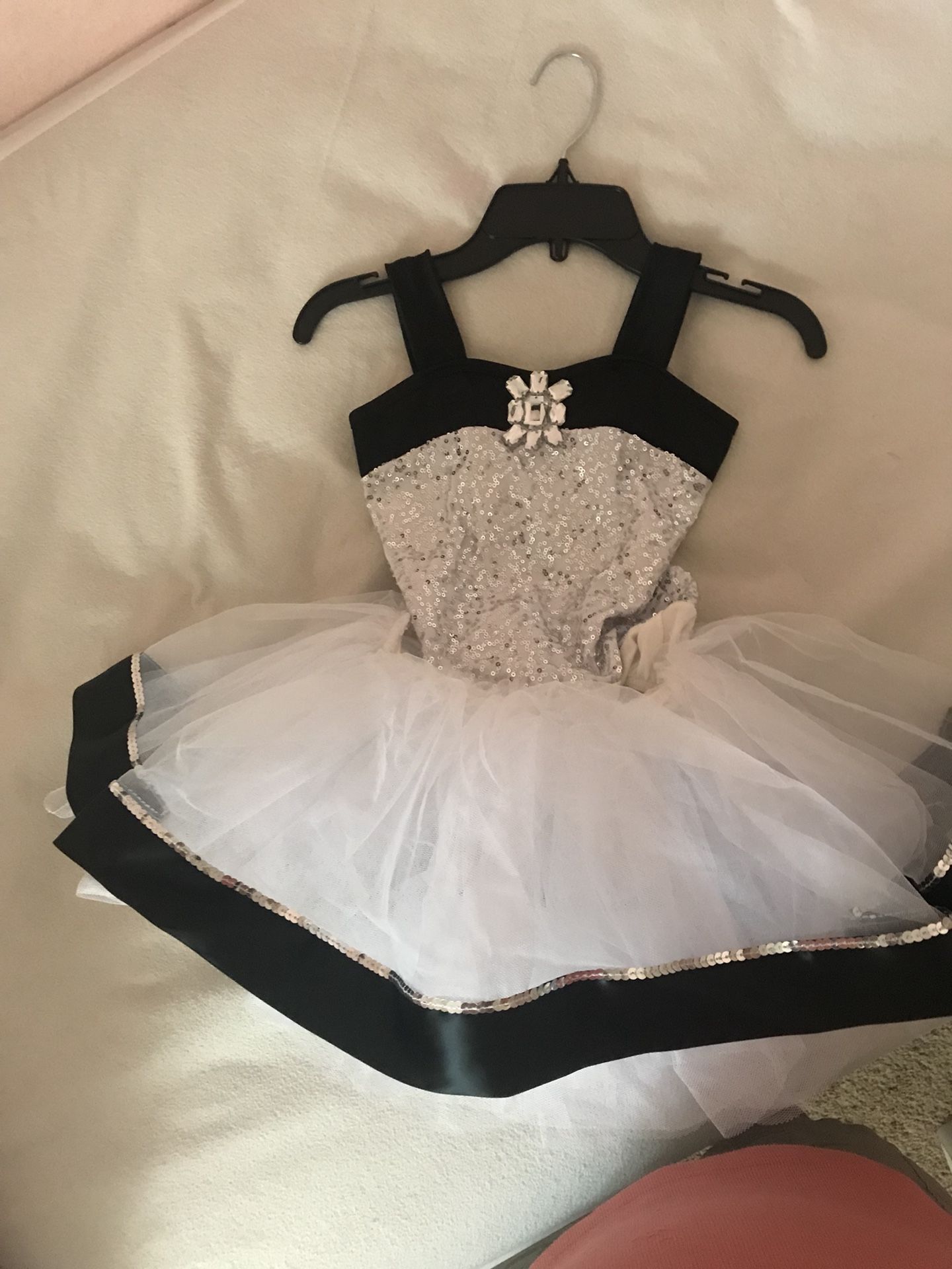 2 piece costume made of white tulle and black satin ribbon trim with shimmery sequins size child’s 5/6. Perfect for play time dress up or early Halloween costume planning. Quality made and from a smoke free home.