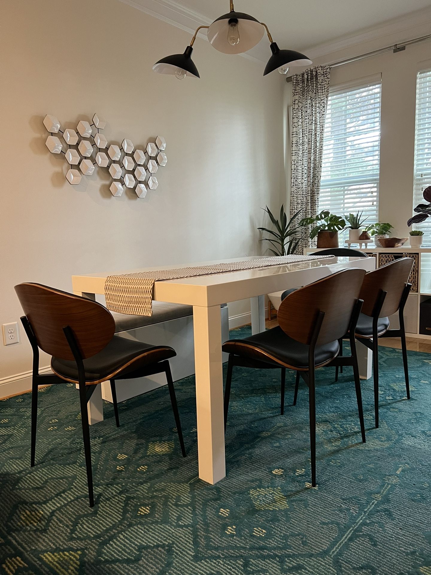 These chairs will be a stylish addition to your dining room! (Please note the listing is for the chairs only—table not included.) We purchased about three years ago and they have been gently used (we don’t use our dining room daily) and are still in great condition! The bentwood has a lovely grain and the black metal legs are sleek and sturdy but lightweight. The cushioned seats and backs are easy to wipe clean and so comfy—perfect for sitting and catching up with friends over a meal! One chair has a couple of small scratches in the trim of the seat (see pictures) but they detract minimally from the appearance. We’ve recently found a set of vintage dining chairs—my dream!—and are sad to part with these, but we eager not to have eight chairs in the dining room! :) Thanks for shopping!