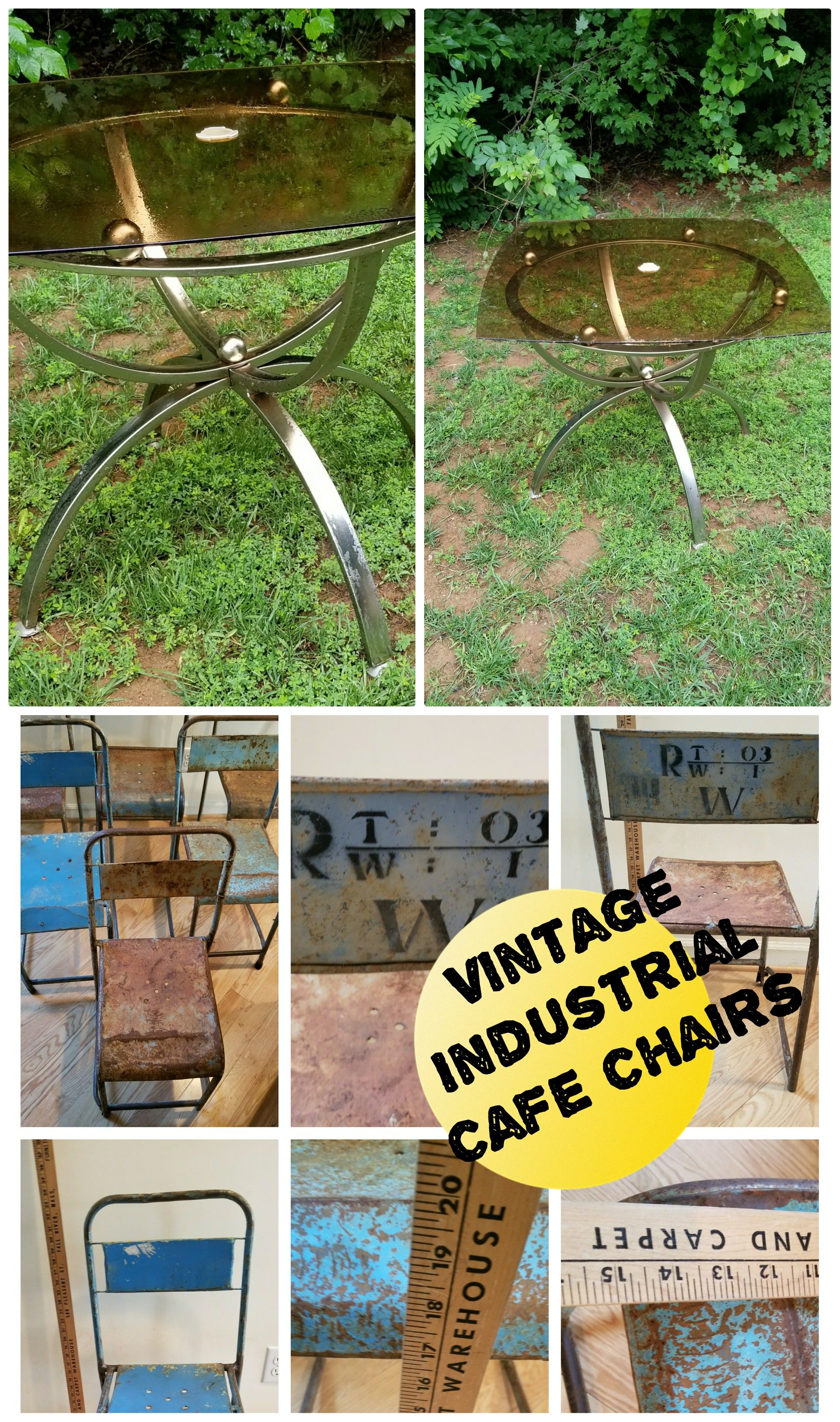 Glass top table with six vintage stackable chairs
