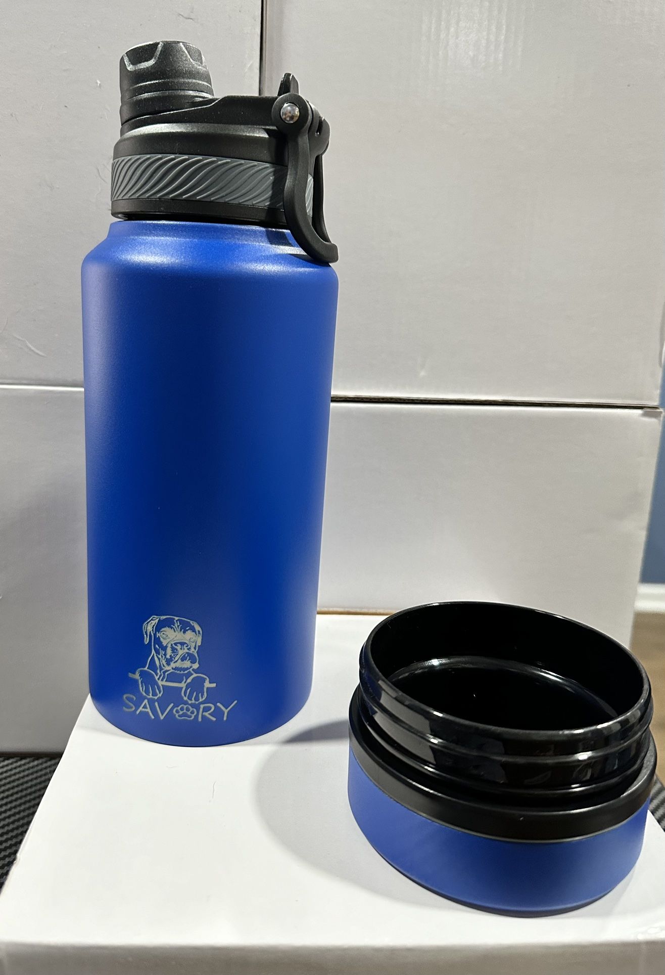 All-in-one Travel pet food and liquid for car, hiking, camping. Leak proof, doubled wall insulated. Keeps water cold for hot days. 32 oz