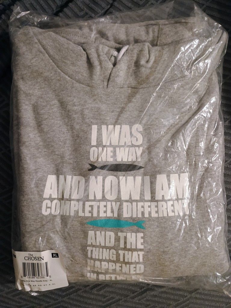 New and sealed. This one says in the shape of a cross on the front, " I was one way and now I'm completely different and the thing that happened in between was him". Color is gray. The price is firm. Pick up is in Burien only. I have other chosen merchandise on my page. God bless, have a Merry Christmas, and a Happy New Year!