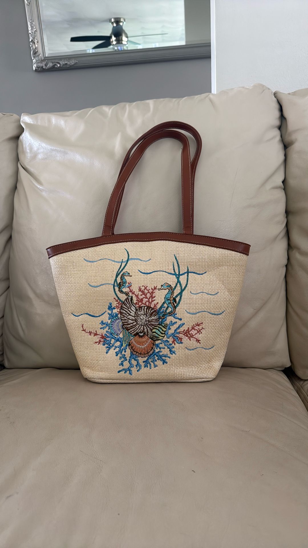 Nice!! Capelli Straworld Inc Purse. With a beautiful embroidery on the front with seahorses with the eyes as gems. Beautiful colors! In great shape!