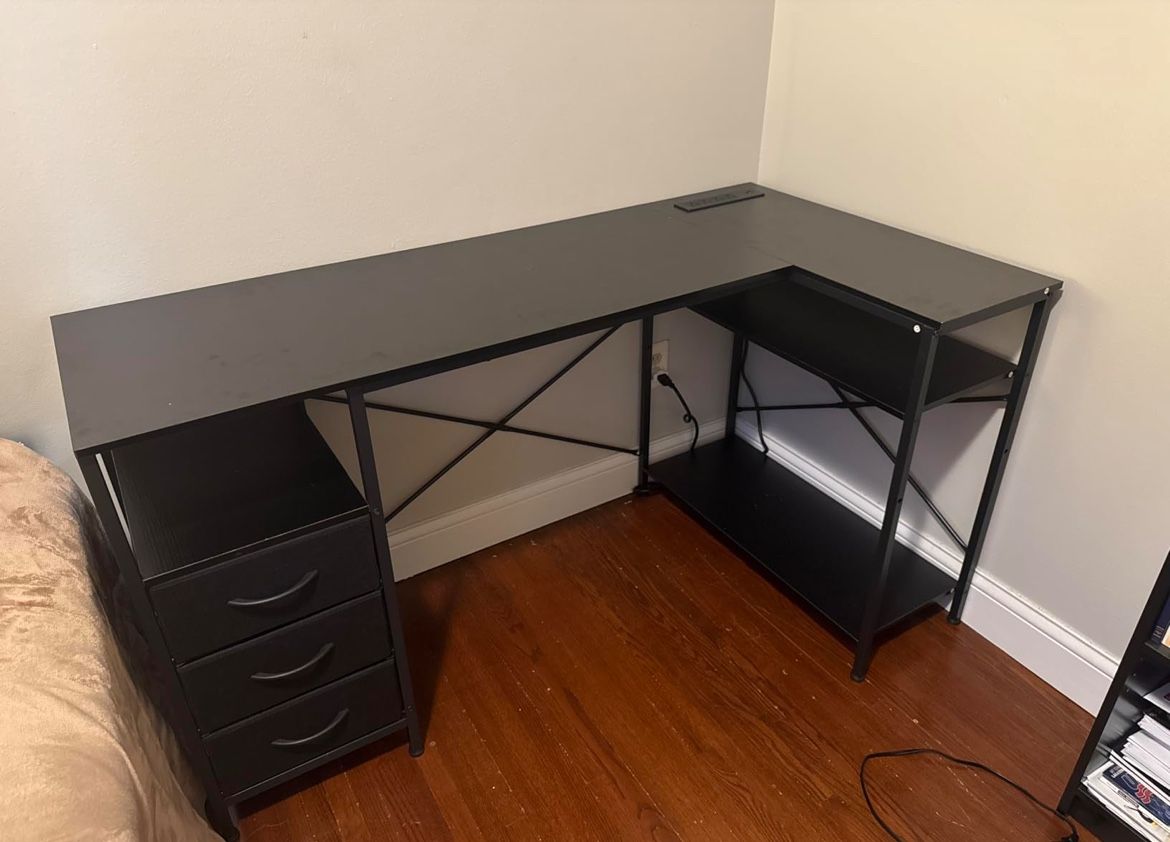 L Shaped Office Desk with Power Outlets, 47 Inch Computer Desk with 3 Drawers, Shelves, for Gaming, Corner Work, Home Office, Study,