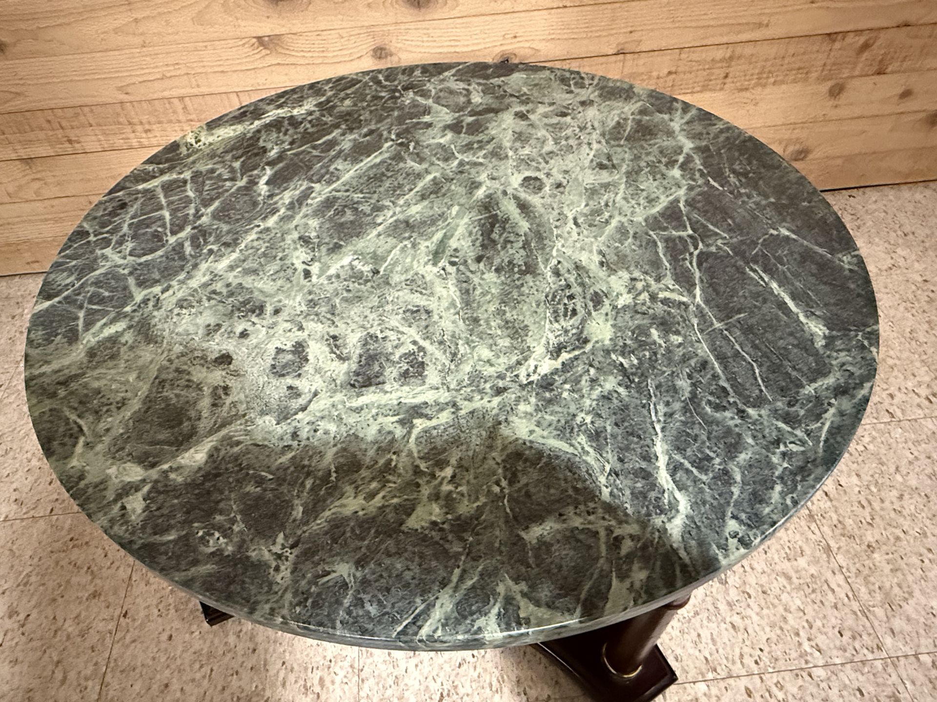 Round stone top coffee or end table. 27”. Walnut finish with gold trim.