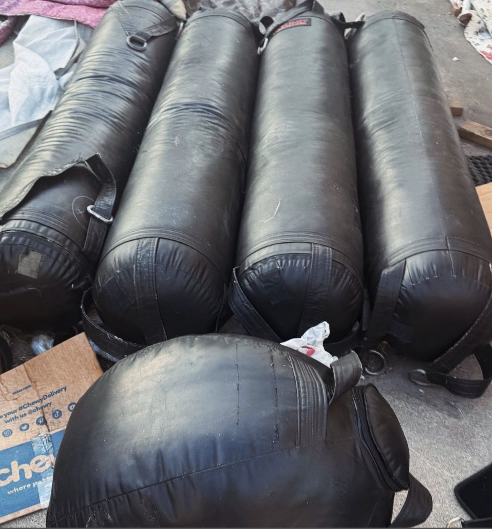Price is firm . Already priced cheap . Lower offers will be blocked instantly . Boxing Bags are in good condition , no tears , they’ve been covered from the sun & rain but jsut collecting dust and don’t really have space for them . With a quick wipe down and leather cleaner , they will look good as new They weigh130lb cloth filled pro bags . They have straps on each side so you can rotate them to rotate the weight distribution. The platform they sit in is about 8ft so the bags are about 60-72inches . Asking only $100 ea. 130lb heavy bag , but only selling 3 , take all 3 for $80/ea Round bag is firm at $120 Commercial grade Heavy duty frames available for very cheap also if interested .