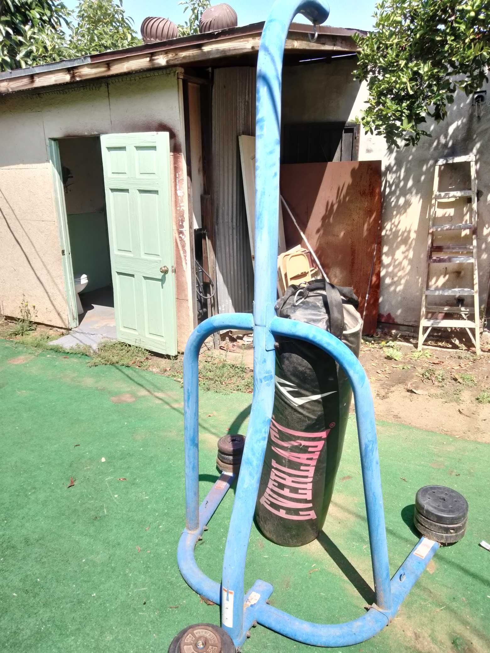 Punching bag set up with weight plates to hold it down Great condition Located in east Los Angeles Thank you Keep in mind that the bar is a little rusty and also some plates are a little rusty but very minimum