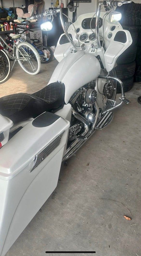 Custom built bagger with crazy horse power .. torq .. touch screen .. custom built speakers system .. custom handle bars .. custom exhaust.. everything custom on the Harley Davidson.. good for car shows ..