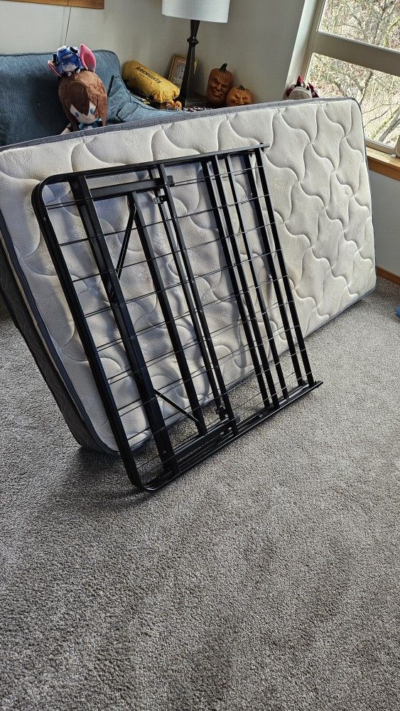Mattress has some staining but I promise it's not from anything gross haha, just from general use over time. Has been cleaned. Foldable frame still solid and works great.
