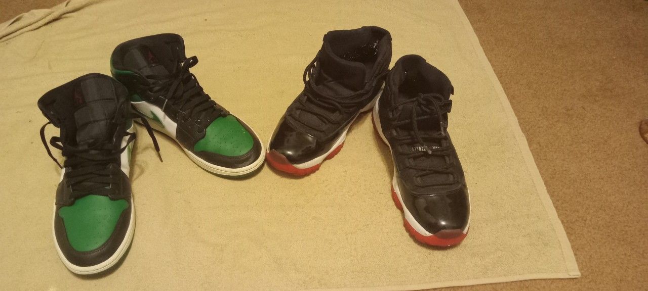They're used Size 12 $50 for the green jordan 1 $30 for the jordan 12 The jordan 1 green toe are in really good condition The 12's are in good wearable condition for being from 2012