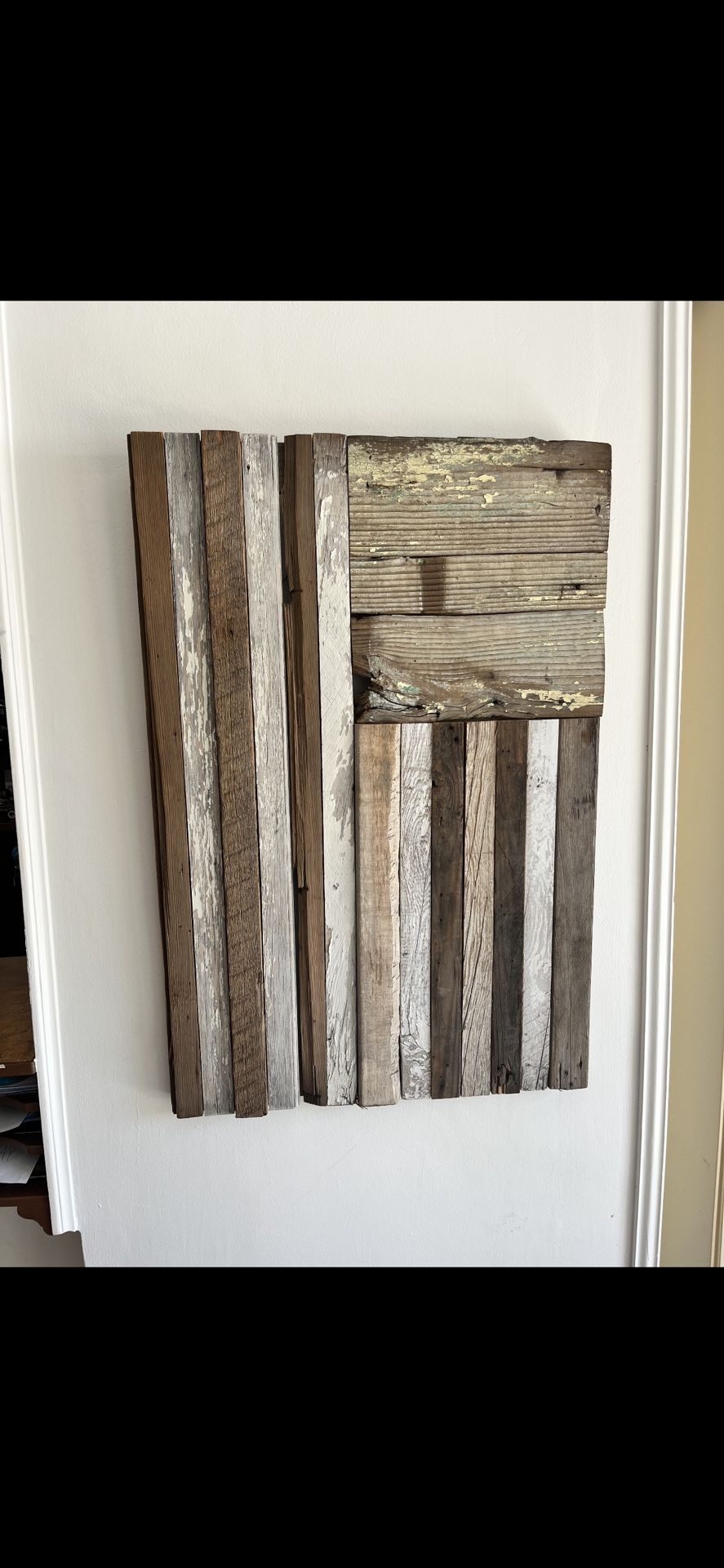 Handmade would American flag. Love this our peace, but will not fit in our house anymore… Measurements and photos. Thank you.