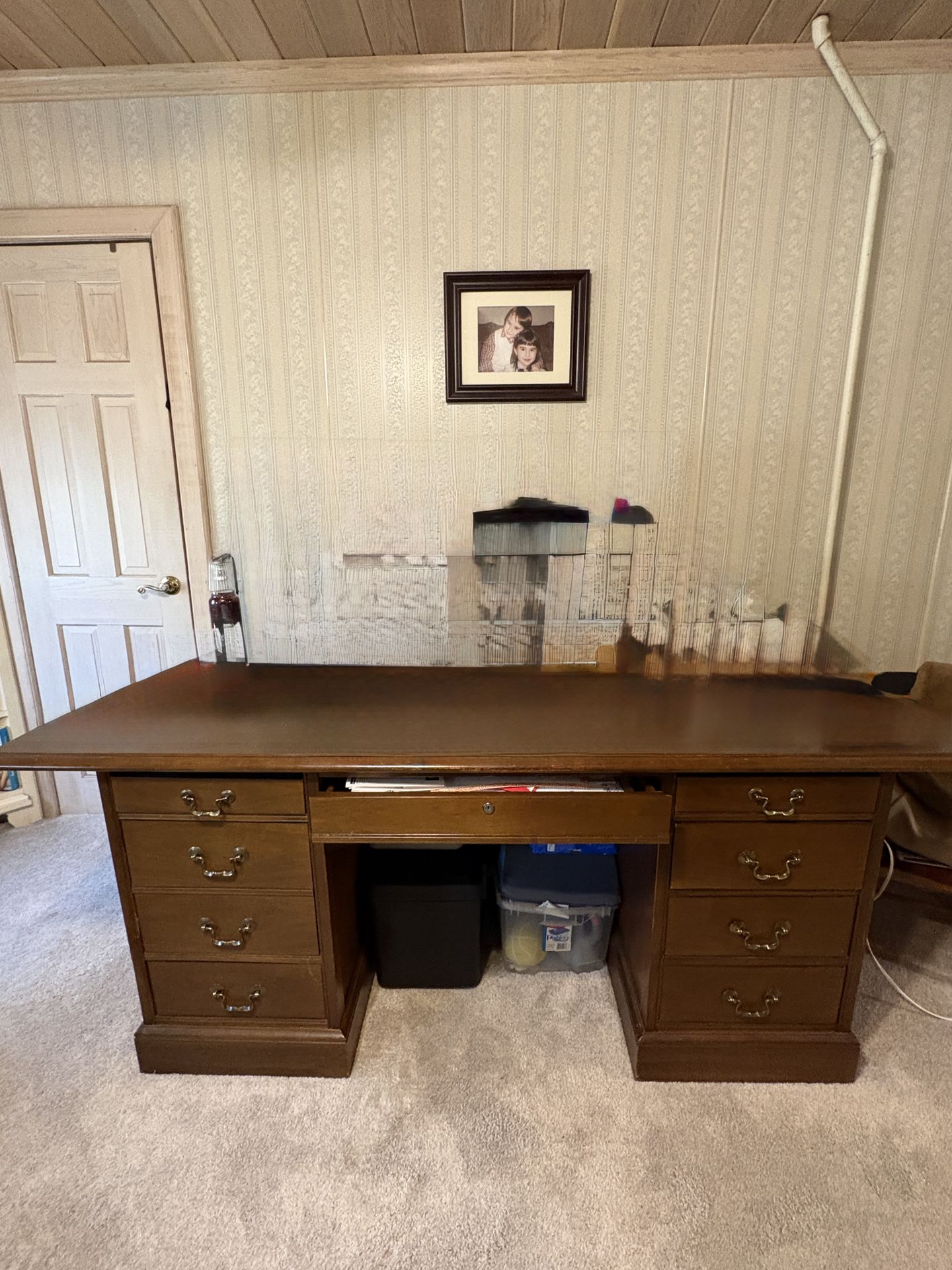 Vintage wooden desk - used but in great shape. Photo edited to remove items on it. 75” wide; 38” deep; 28 1/2” tall. VERY heavy and STURDY. Top unscrews for transport. Must pick up. CASH ONLY. No Venmo No Zelle. Ideal for professional or home office.