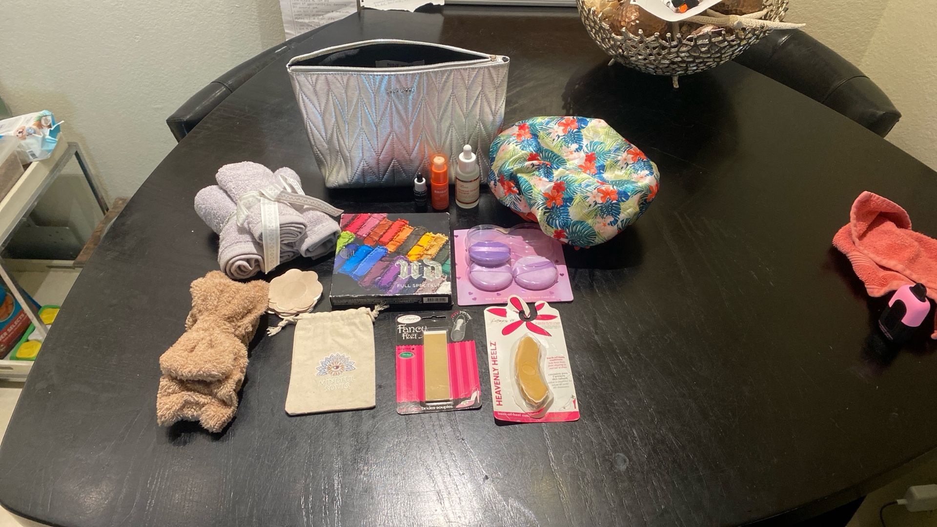 Girlie stuff Urban decay eye shadow pallet Shower cap Headband Good molecules exfoliating treatment Lancôme genifique Vitamin C brightening serum Mindful souls bag Nine West make up bag Set of 4 new wash clothes 3 circle make up puffs 17 Flower nipple covers Thera well soothing back & abdominal wrap Heavenly heels Fancy feet Dr. Scholls dream walk high heel inserts Turbie twist