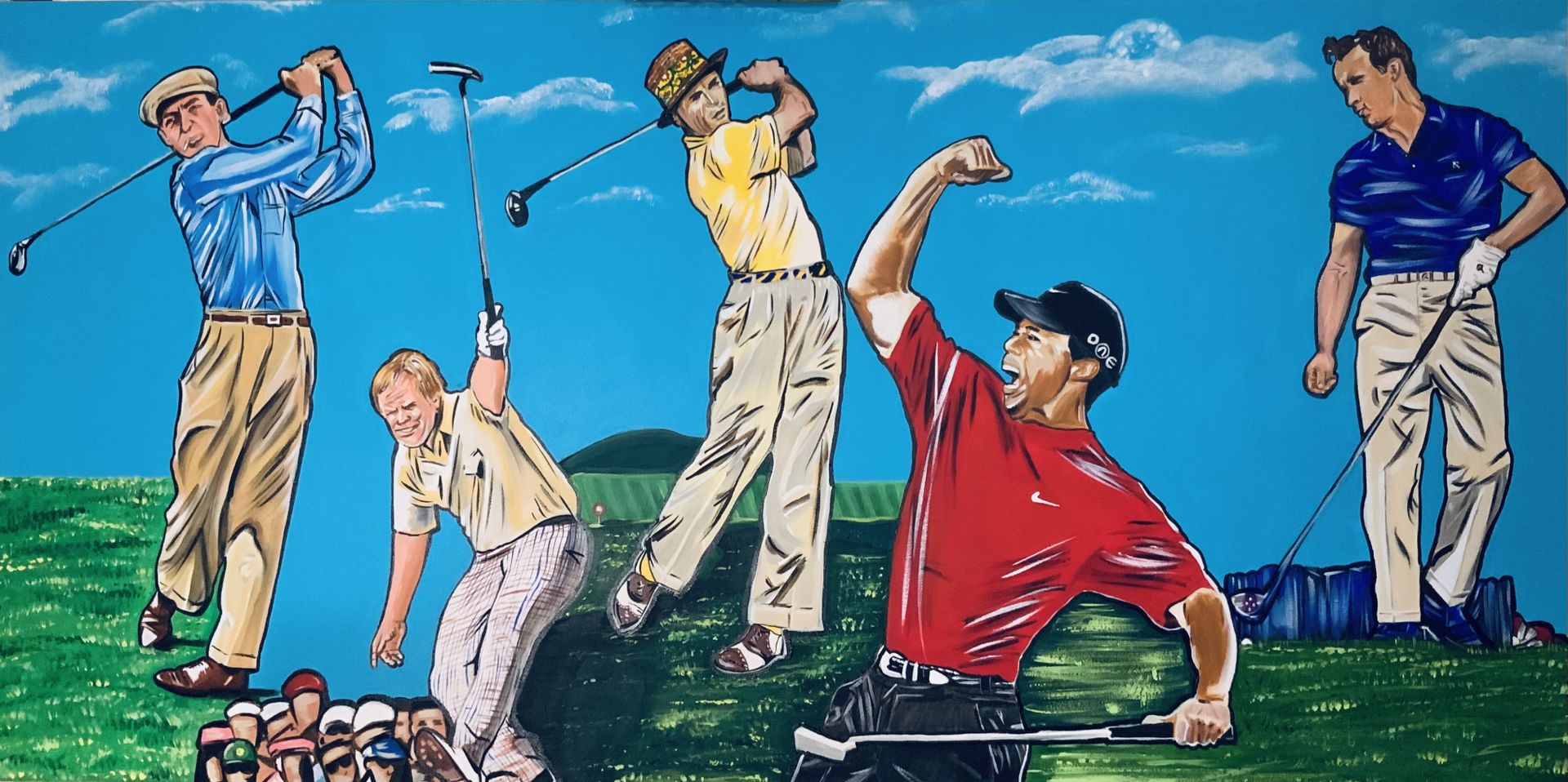 Clear Blue Skies is an original acrylic piece on linen canvas that measures 48”x24”. This colorful piece was created in 2025 by Buford artist, Ed Camen. The piece features golf greats Ben Hogan, Jack Nicklaus, Sam Snead, Tiger Woods and Arnold Palmer. Support local Artists. Look at the vibrant colors! The seller is the artist!