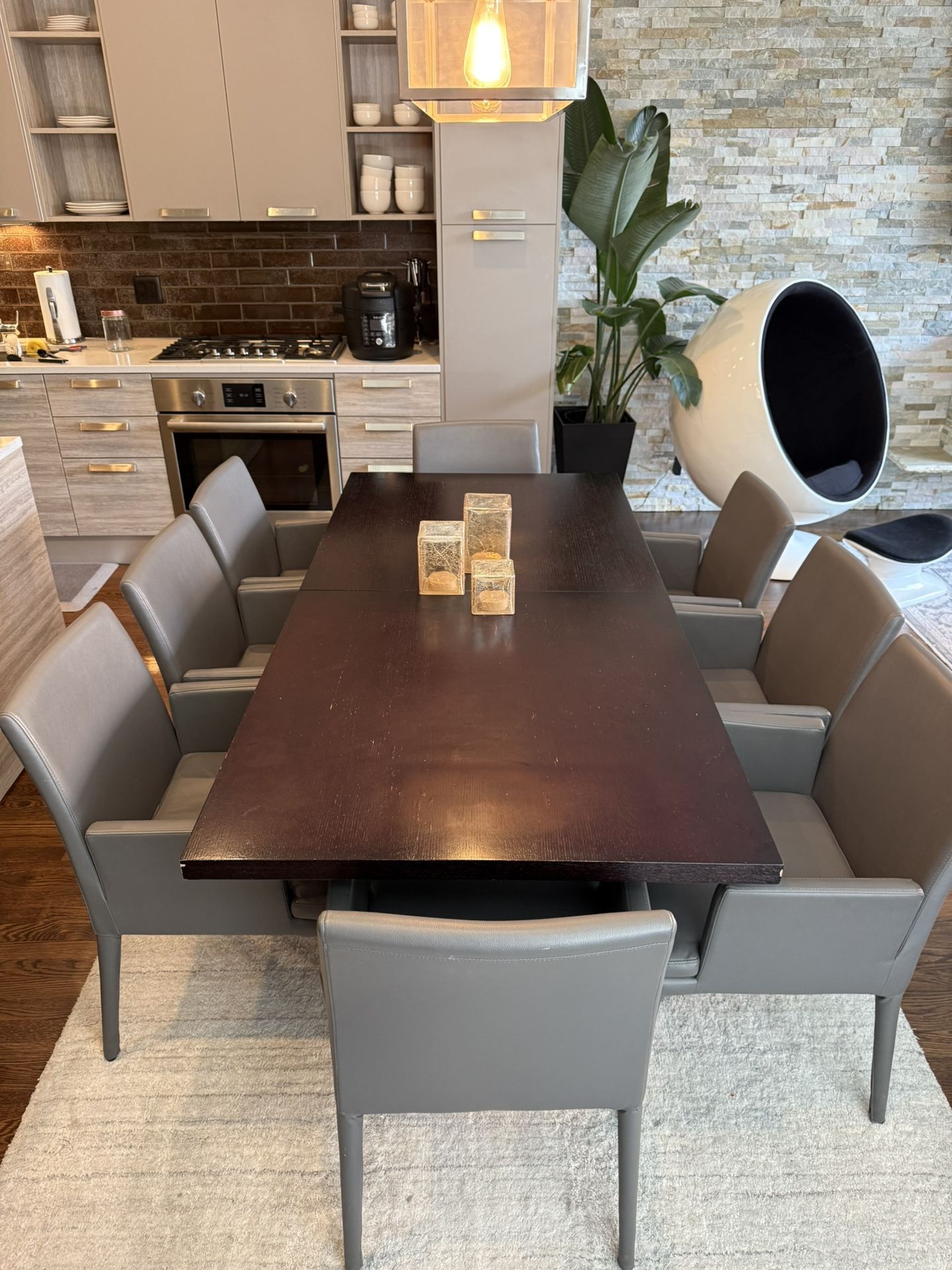 Contemporary rectangular dining table in dark espresso finish. Measures 75” L x 35.5” W and extends to 95” with a 20” removable leaf. Comes with 8 grey leather chairs (18" L x 18" W x 33.5" H along back) Seats 8 comfortably. Clean modern lines, sturdy construction. Great for condos or modern homes. Originally purchased for $3500 Cash/Zelle and pick up only