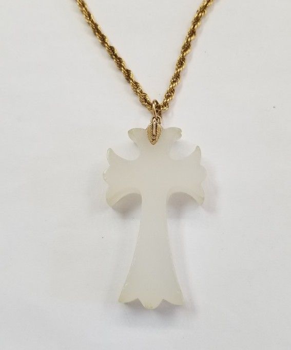 Nice thich frosted glass cross. Is on a gold filled rope chain. Chain is 3+mm thick and 26 inches long.