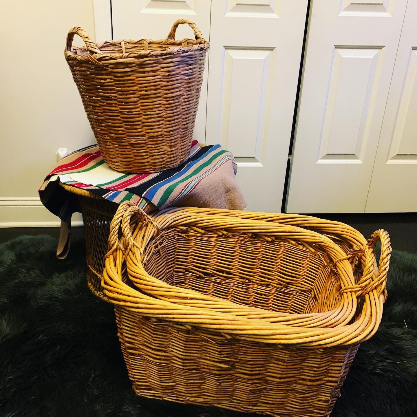 3 large very vintage wicker baskets. 1 rattan basket $28 2 nesting willow baskets $55 set wool runner $32. DM to purchase... baskets are local pick up only.